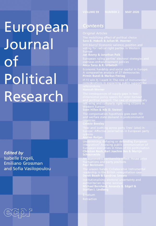 European Journal of Political Research está especializa en artículos originales teóricos o metodológicos que articulan perspectivas conceptuales y comparativas sobre ciencia política. Las suscripciones a la revista incluyen el Political Data Yearbook que ofrece resultados de elecciones,... (Ver más...)