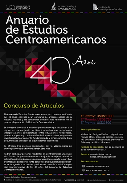El Anuario de Estudios Centroamericanos, fundado en 1974, es publicado por la Universidad de Costa Rica y, en la actualidad, es una de las pocas publicaciones que, con perspectiva regional, se publican sobre América Central. El Anuario de Estudios Centroamericanos se ocupa del análisis de la... (Ver más...)